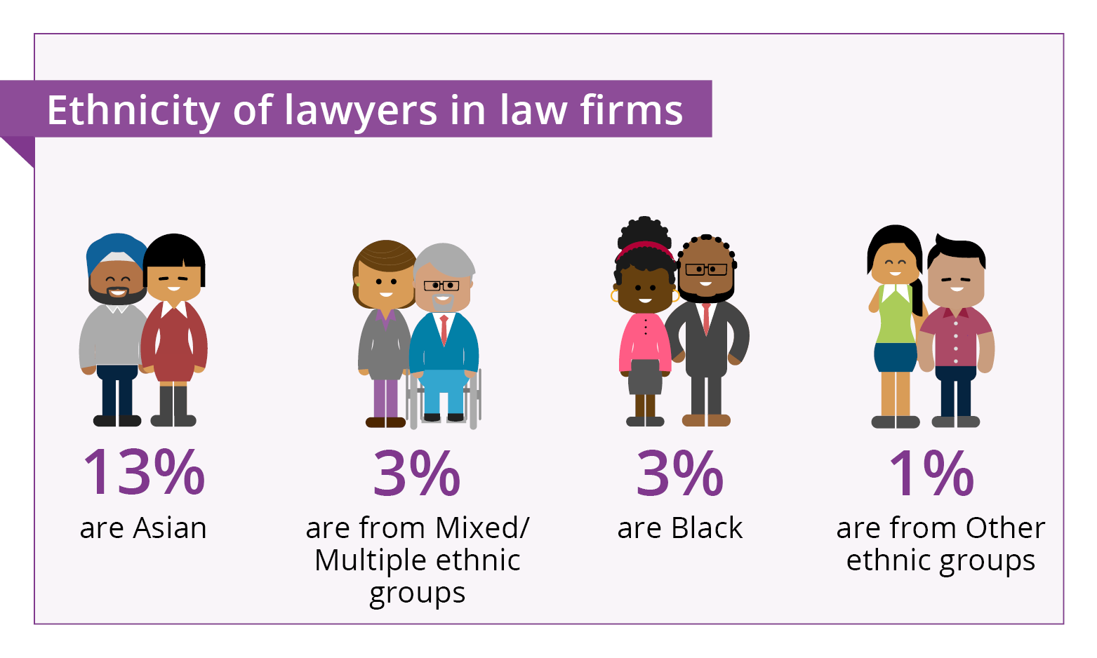 - Overall, 19% of partners were from a Black, Asian or minority ethnic background, but in the largest (50+ partner) firms this was only 9%.