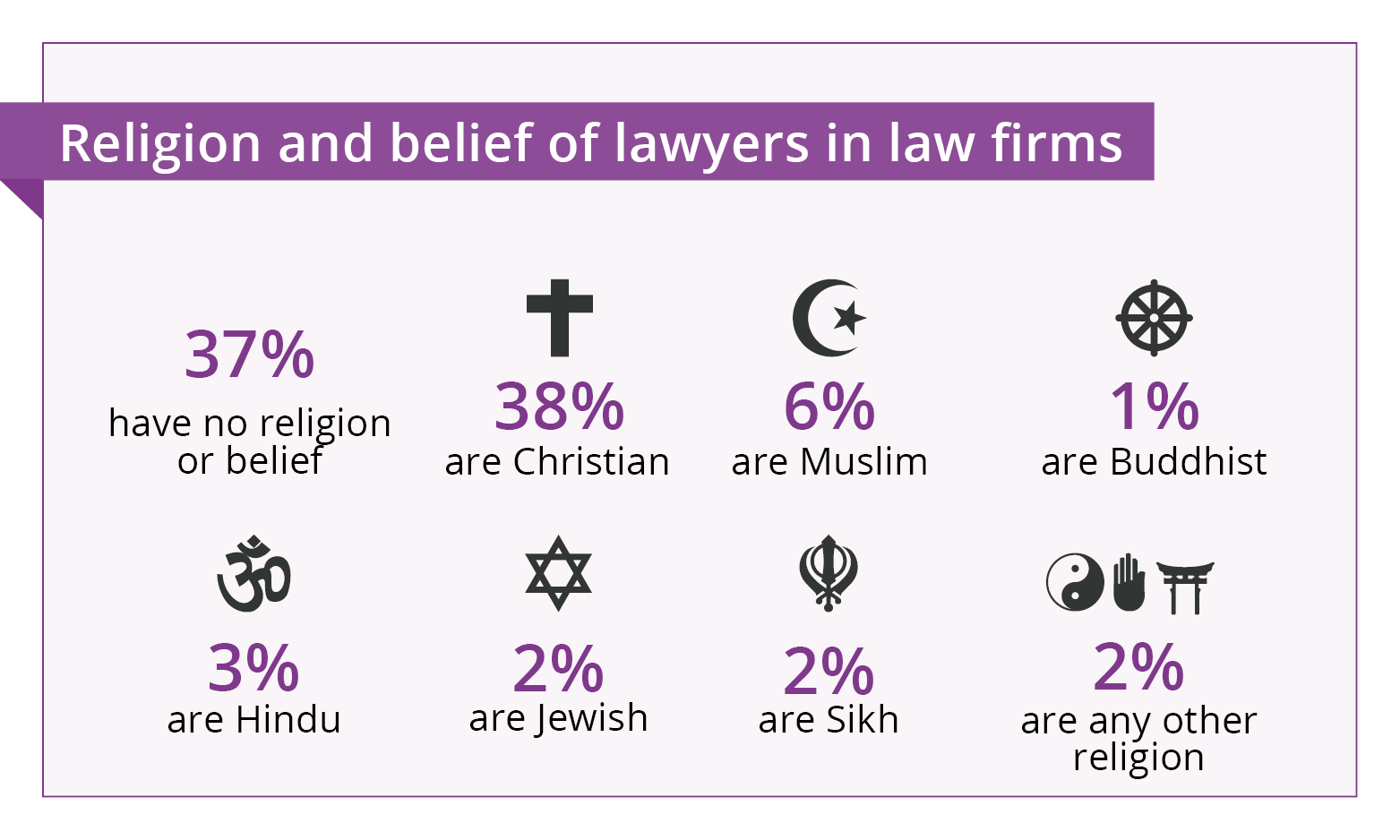 - 21% of lawyers in one-partner firms had no religion or belief compared with 42% in firms with 50+ partners